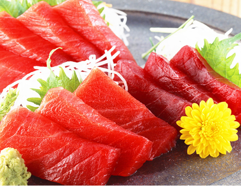 金槍魚共計約30余品種,經濟價值較高的有藍鰭金槍魚、馬蘇金槍魚、大眼(也叫大目)金槍魚、黃鰭金槍魚、長鰭金槍魚、鰹魚六個種類。前四種主要制作生魚片,后兩種主要制作金槍魚罐頭。金槍魚的肉質非常特別,生食味美,口感極佳。